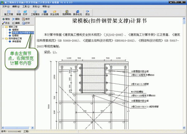 单击左侧的计算项目节点,我们就可以预览计算书的内容。通过这样的操作,您就可以轻松的查看生成的计算书文档,也可以打印需要的计算书,非常方便。您还可以把工程文件发给您的同事,他可以预览或者打印输出这些计算书,有利于数据的传递。这种方式是本公司独创的,一定对您的工作很有帮助。